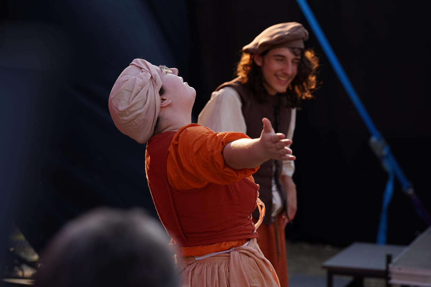 Je me suis imaginé bâtir l’histoire en matriochkas, une pièce dans une pièce dans une pièce, le procédé permettant d’une part d’autonomiser les répétitions de plusieurs ateliers de théâtre ouverts dans les huit communes participant à l’opération, et d’autre part d’utiliser des niveaux de langage différents suivant que telle pièce serait dédiée à tel atelier ou à tel autre. Pour être honnête, il y a aussi une forme de plaisir ludique à multiplier les intrigues et à mélanger les temps au point de s’emmêler les pinceaux ; d’ajouter, si l’on veut, une nuit aux mille et unes autres et de la faire durer le plus possible, aussi longtemps que dure la félicité de visiter des lieux que ne borne rien que la fantaisie : pour une fois qu’on peut sans risque jouer un vilain bon tour aux gendarmes, effacer les méchants d’un coup de mousquet, ressusciter les gentils et faire triompher l’amour, ne nous dépêchons pas de revenir aux réalités.